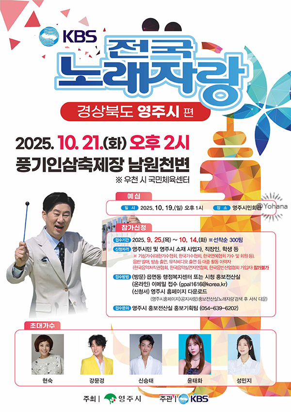 10월 21일(화) 오후 2시에는 KBS “전국노래자랑” 영주시 편이 축제장 남원천변에서 공개녹화돼요. 초대가수 현숙, 강문경, 신승태, 윤태화, 성민지가 출연해 현장의 열기를 더합니다. 예심은 10월 19일(일) 영주시민회관에서 열려요.