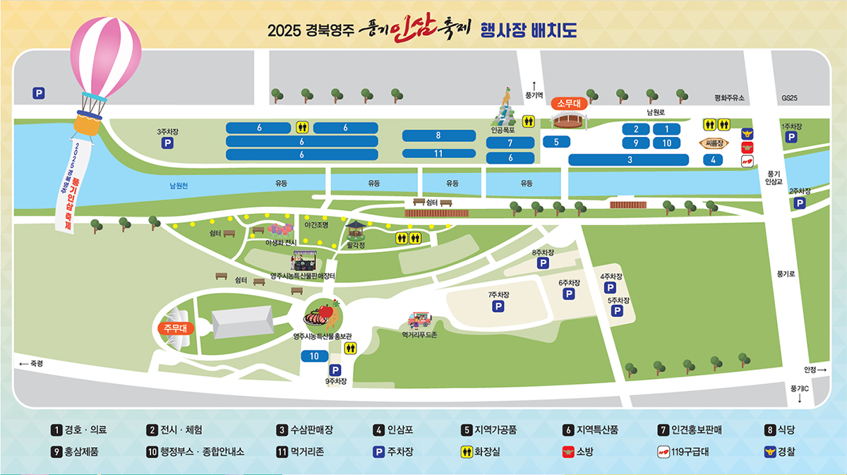 행사장은 영주시 풍기읍 남원천변 일대이며, 풍기역에서 도보 약 10분 거리입니다. 자가용 이용 시 영주IC 또는 풍기IC를 통해 진입할 수 있어요. 축제 기간 동안 풍기읍 일대에는 무료 임시주차장이 운영되며, 행사장까지 도보 5~10분 거리에 위치해요. 입장료는 무료이며, 일부 체험 활동은 소정의 체험비가 있을 수 있어요.