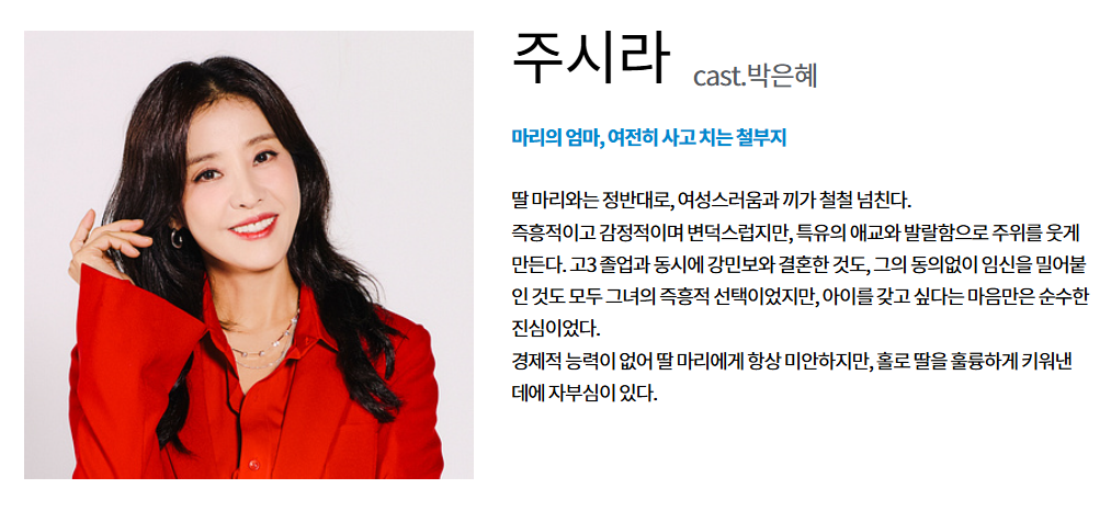 마리의 엄마. 충동적이고 감정 기복이 심하지만, 사랑만큼은 진심. 과거 남편 동의 없이 임신하여 마리를 낳은 복잡한 사연의 주인공.
