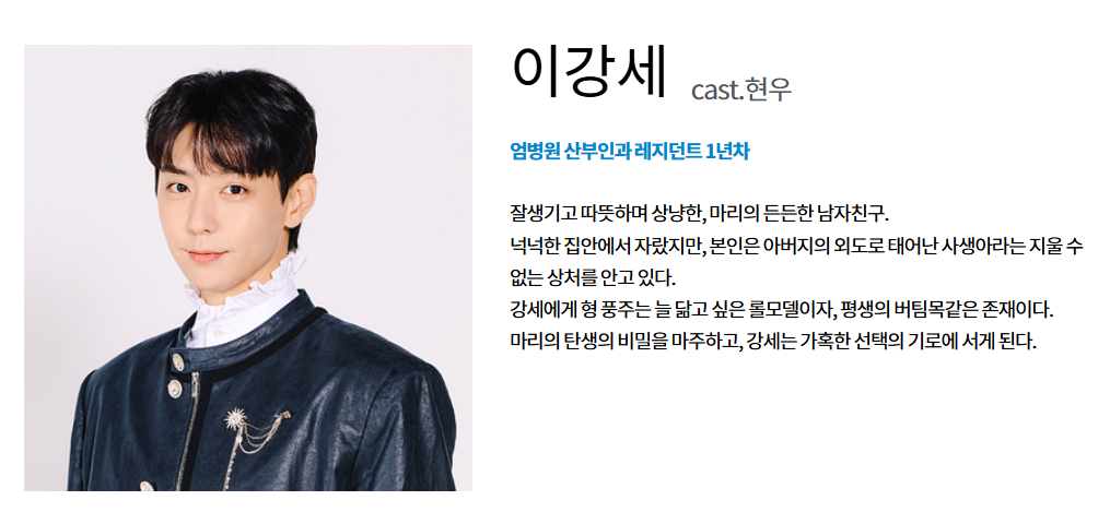 마리의 남자친구이자 레지던트. 다정하고 따뜻한 성격이지만, 사생아로 태어난 자신의 과거로 인해 깊은 내면의 상처를 안고 살아갑니다.