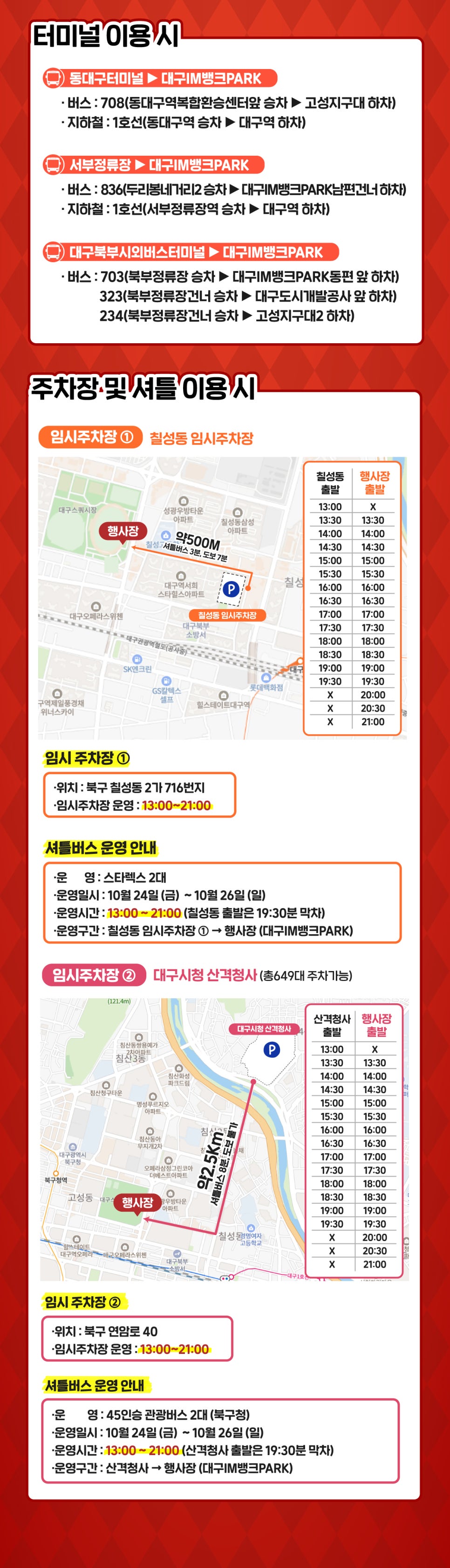 - 셔틀버스: 산격청사 ↔ 행사장 (11:00 ~ 21:00, 20분 간격)